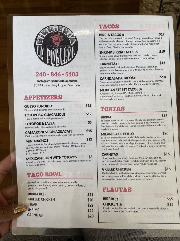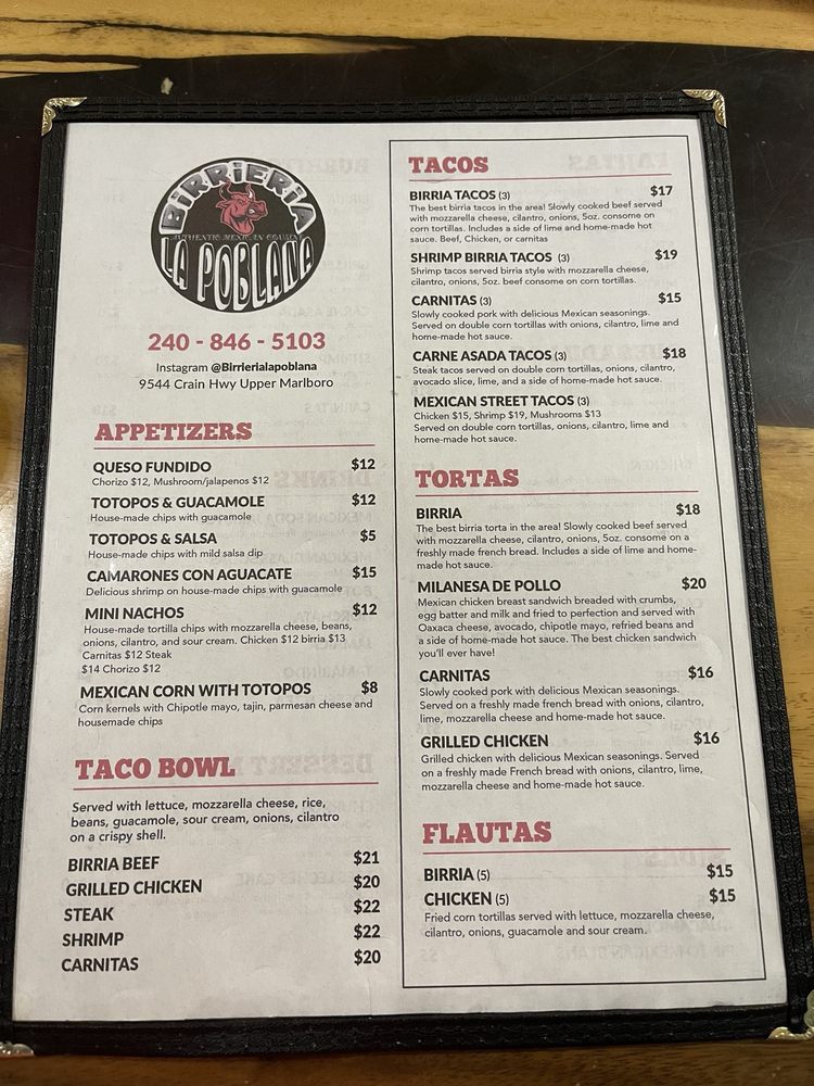 Introducing the menu at Birrieria la Poblana, a hidden gem in Upper Marlboro, MD. Offering a variety of birria-style dishes including the must-try Birria Torta on French Bread and Birria Quesadilla. Customers rave about the flavorful chicken birria tacos and perfectly cooked carne asada tacos. The menu also features delightful horchata to pair with your meal. With excellent customer service, a cozy ambiance, and authentic Mexican flavors, Birrieria la Poblana stands out as a top spot for tacos and margaritas. Don't miss out on their shrimp birria tacos and tres leches cake for a truly satisfying dining experience. With options for delivery, takeout, catering, and outdoor seating, this is a go-to destination for Mexican cuisine enthusiasts.